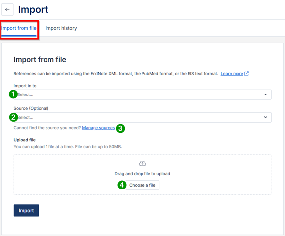 Dans la section Import references du projet sur Covidence, cliquez sur le bouton Import.