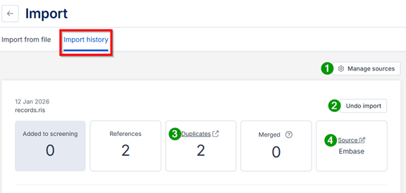 Depuis cet onglet, vous pouvez importer des références dans Covidence. Prenez le temps de vous familiariser avec les principales fonctions de l’interface :